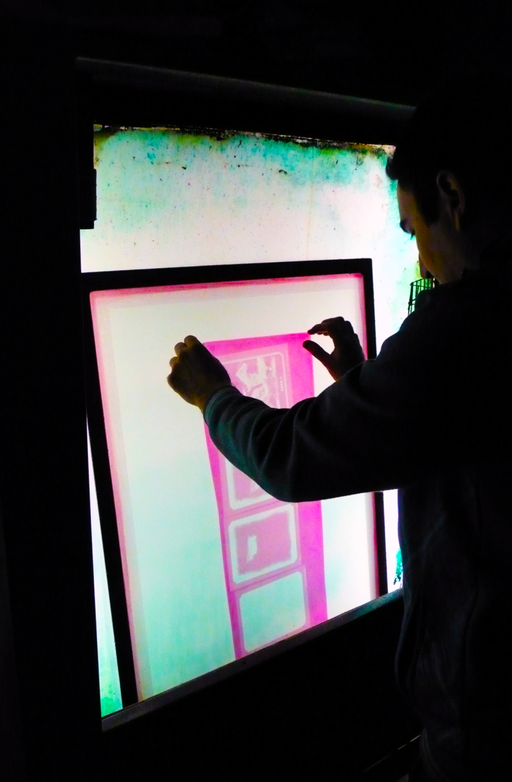 - Diese Vorlagen werden zusammen mit einem beschichteten, lichtempfindlichen Film in der Dunkelkammer belichtet (wie früher bei der Fotografie).